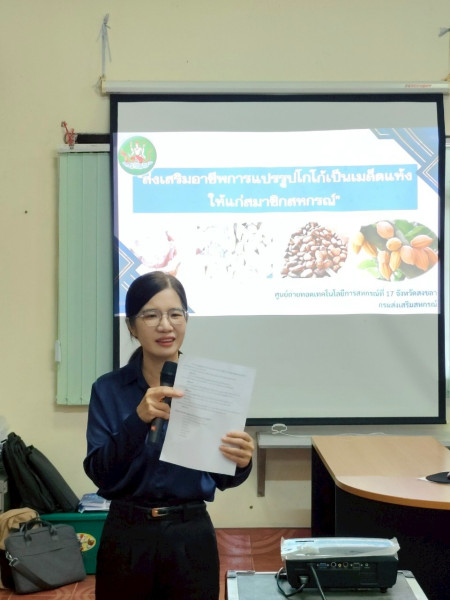 วันที่ 10 มิถุนายน 2568 นางสาวสุพา ปิยะเขตร ผู้อำนวยการศูนย์ถ่ายทอดเทคโนโลยีการสหกรณ์ที่ 17 มอบหมายให้ นางชุติมา วัชรีบำรุง นักทรัพยากรบุคคลชำนาญการ น.ส.นิรฌา เทพวารินทร์ นักทรัพยากรบุคคลปฎิบัติการ และนางหทัยทิพย์ ทองตั้ง นักทรัพยากรบุคคล ดำเนินการจัดโครงการสหกรณ์ รัฐคนละครึ่ง พึ่งพิงกัน หลักสูตร #ส่งเสริมอาชีพการแปรรูปโกโก้เป็นเมล็ดแห้งให้แก่สมาชิกสหกรณ์ ให้แก่สหกรณ์กองทุนสวนยางหนองบัว จำกัด จังหวัดตรัง จำนวน 50 คน เพื่อให้สมาชิกมีความรู้ความเข้าใจในการปลูกดูแลรักษาโกโก้เบื้องต้น เรียนรู้กระบวนการแปรรูปโกโก้ให้เป็นเมล็ดแห้งเพื่อเพิ่มมูลค่า และเป็นการส่งเสริมอาชีพให้แก่สมาชิก ณ ห้องประชุมสหกรณ์กองทุนสวนยางหนองบัว จำกัด อำเภอรัษฎา จังหวัดตรัง.