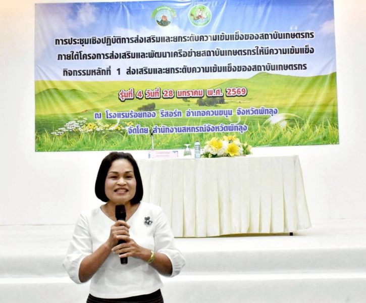28 มกราคม 2569 : นางสาวสุพา ปิยะเขตร ผู้อำนวยการศูนย์ถ่ายทอดเทคโนโลยีการสหกรณ์ที่ 17 จังหวัดสงขลา ร่วมเป็นวิทยากร โครงการส่งเสริมและพัฒนาเครือข่ายสถาบันเกษตรกรให้มีความเข้มแข็ง กิจกรรมที่ 1 ส่งเสริมและยกระดับความเข้มแข็งของสถาบันเกษตรกร รุ่นที่ 4 จัดโดย สำนักงานสหกรณ์จังหวัดพัทลุง ผู้เข้าอบรม ประกอบด้วย คณะกรรมการ ฝ่ายจัดการ และสมาชิก ของกลุ่มเกษตรกร รวมทั้งสิ้น 100 คนจัดอบรม ณ โรงแรมร้อยทอง รีสอร์ท อำเภอควนขนุน จังหวัดพัทลุง